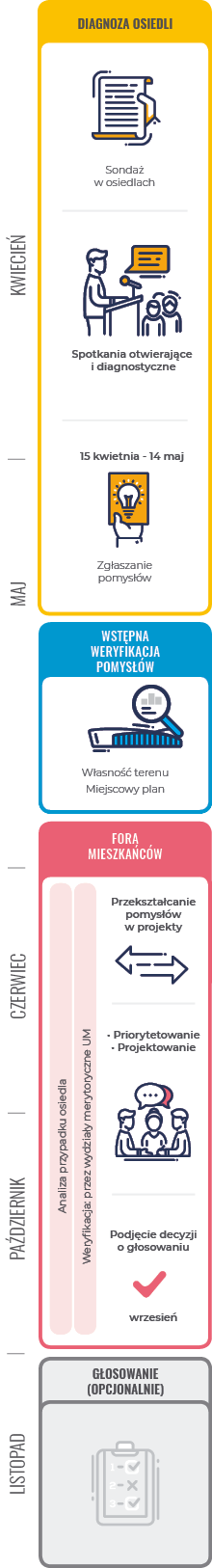 Od maja do października, podczas cyklu spotkań w ramach Forów Mieszkańców, moderowanych przez Animatorów, będą przeprowadzane następujące elementy procesu: • prezentacja zgłoszonych w osiedlu pomysłów, • ustalenie, drogą dyskusji i warsztatów, najważniejszych potrzeb osiedla – priorytetowanie, • doprecyzowanie pomysłów i przekształcanie ich w projekty – projektowanie, • weryfikacja projektów przez właściwe merytorycznie komórki Urzędu Miejskiego, • wypracowanie oraz ustalenie na bazie zgłoszonych pomysłów listy projektów do realizacji w ramach Pakietu Rewitalizacyjnego mieszczących się w kwocie dla osiedla • albo wypracowanie oraz ustalenie maksymalnie listy 3 projektów pod głosowanie, mieszczących się w 3 - krotności kwoty dla osiedla, przy założeniu, iż szacunkowy koszt każdego z tych projektów nie może przekroczyć kwoty przewidzianej dla osiedla. Formuła spotkań w ramach Forów Mieszkańców umożliwia uczestnikom elastyczne kształtowanie tego etapu. Mieszkańcy będą mogli decydować o ilości i terminach spotkań, kolejności procedowania poszczególnych elementów w zależności od liczby pomysłów/projektów w danym osiedlu oraz stopnia ich skomplikowania. Ma to na celu optymalizację procesu poprzez maksymalne dopasowanie do specyfiki poszczególnych osiedli.
